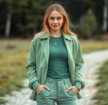 The beauty of this green look lies in the confidence it brings. As the model effortlessly showcases her outfit against a backdrop filled with greenery, her friendly expression and relaxed posture embody that laid-back vibe. This casual yet polished outfit allows you to not only feel good but also look impressive. Perfect for making a statement on a leisurely day or at casual get-togethers, this look showcases how nature can elevate your style.